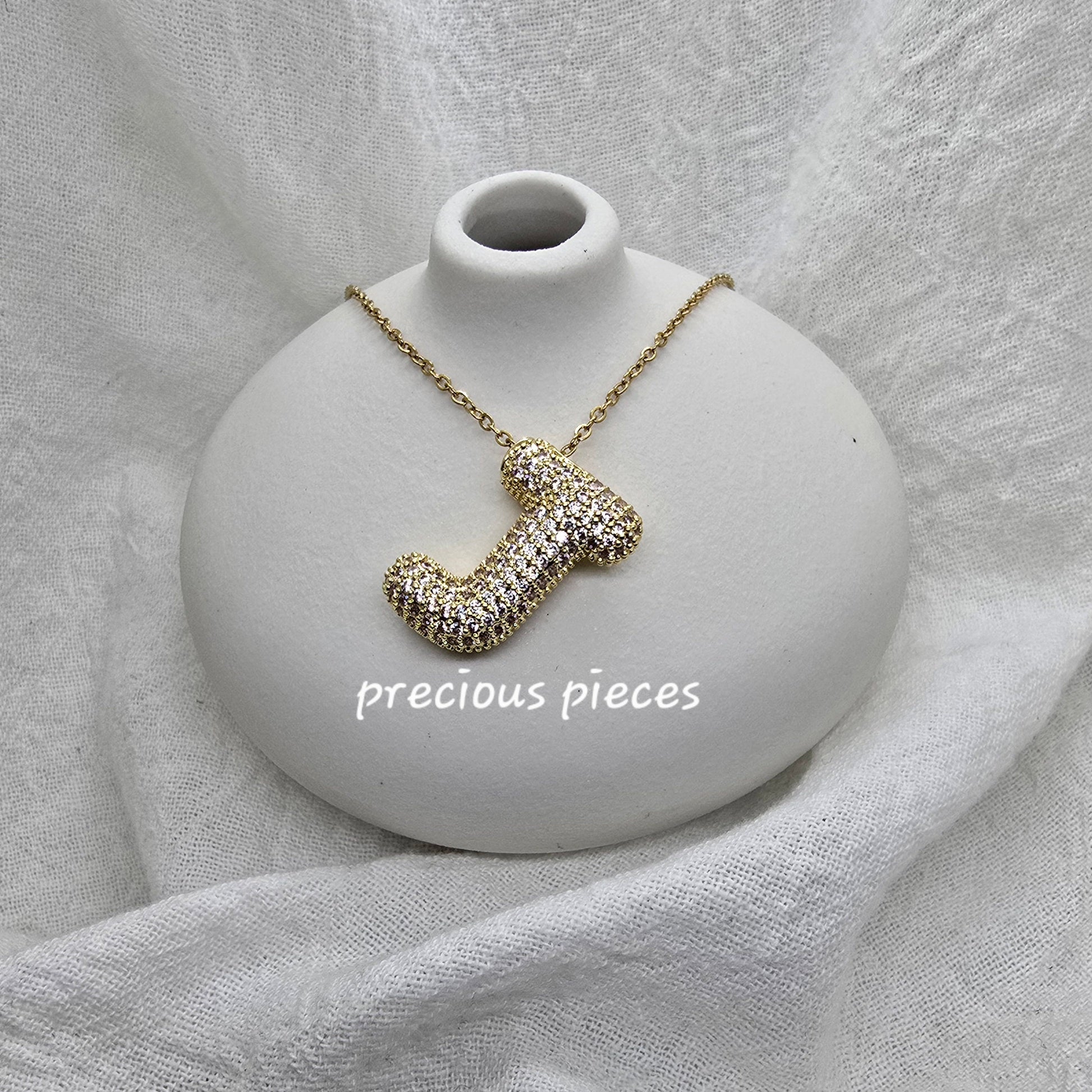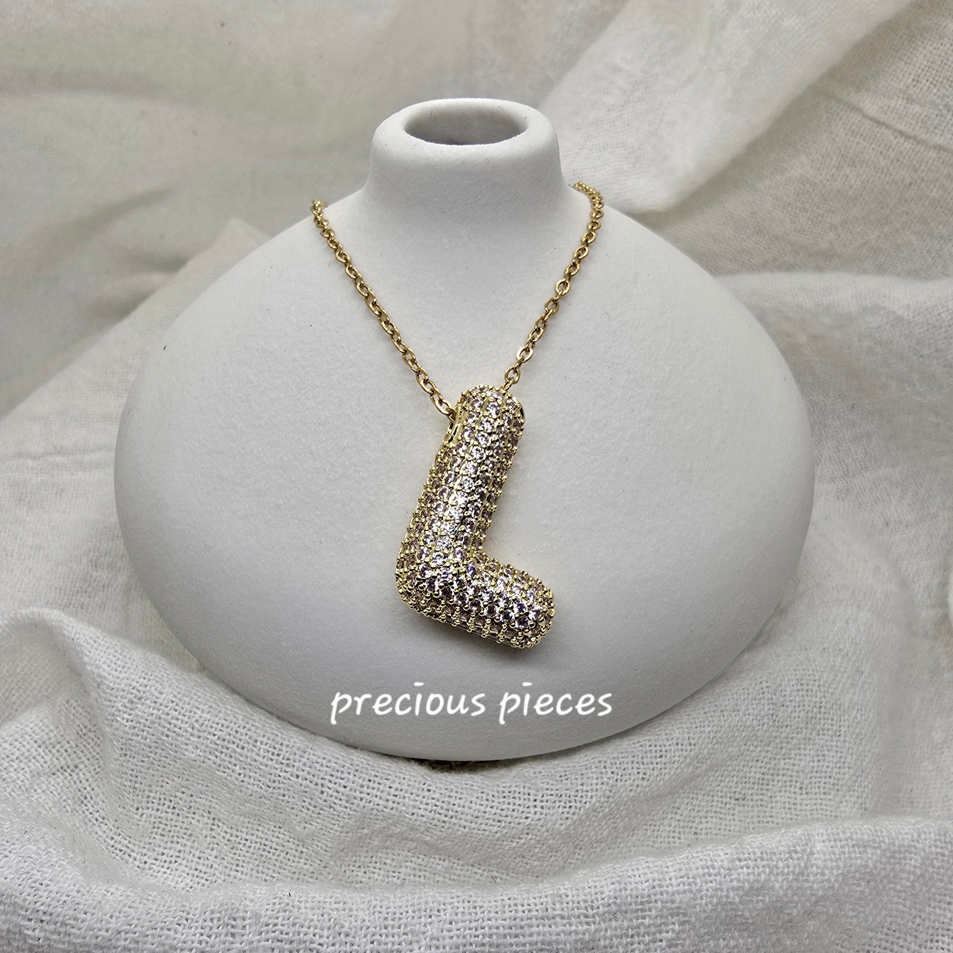 Elevate your jewelry collection with this statement necklace featuring a rhinestone bubble letter charm. Perfect for any occasion, these letters have a fun bubbly font and a chunky dimension. Its front is covered in rhinestones for a glamorous touch while its backside is covered in small heart cutouts. Add this necklace to your collection today.