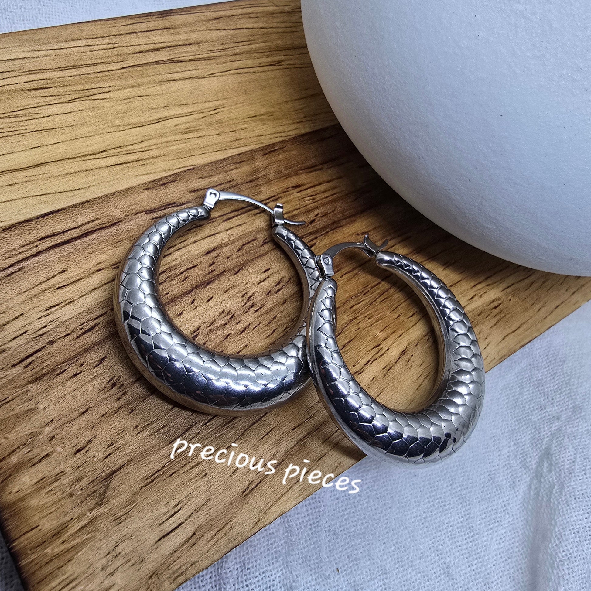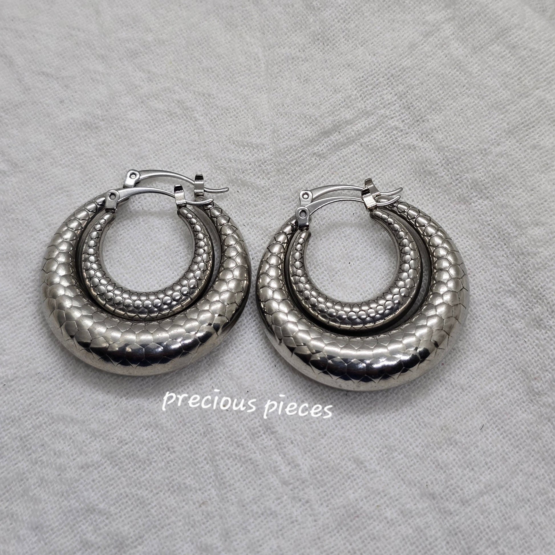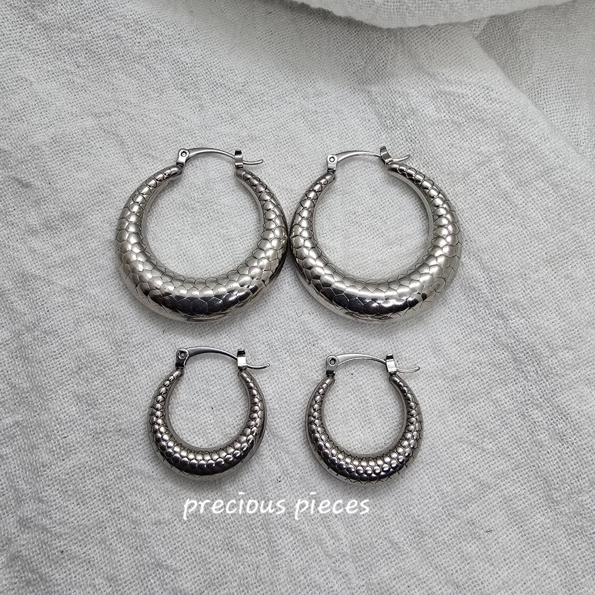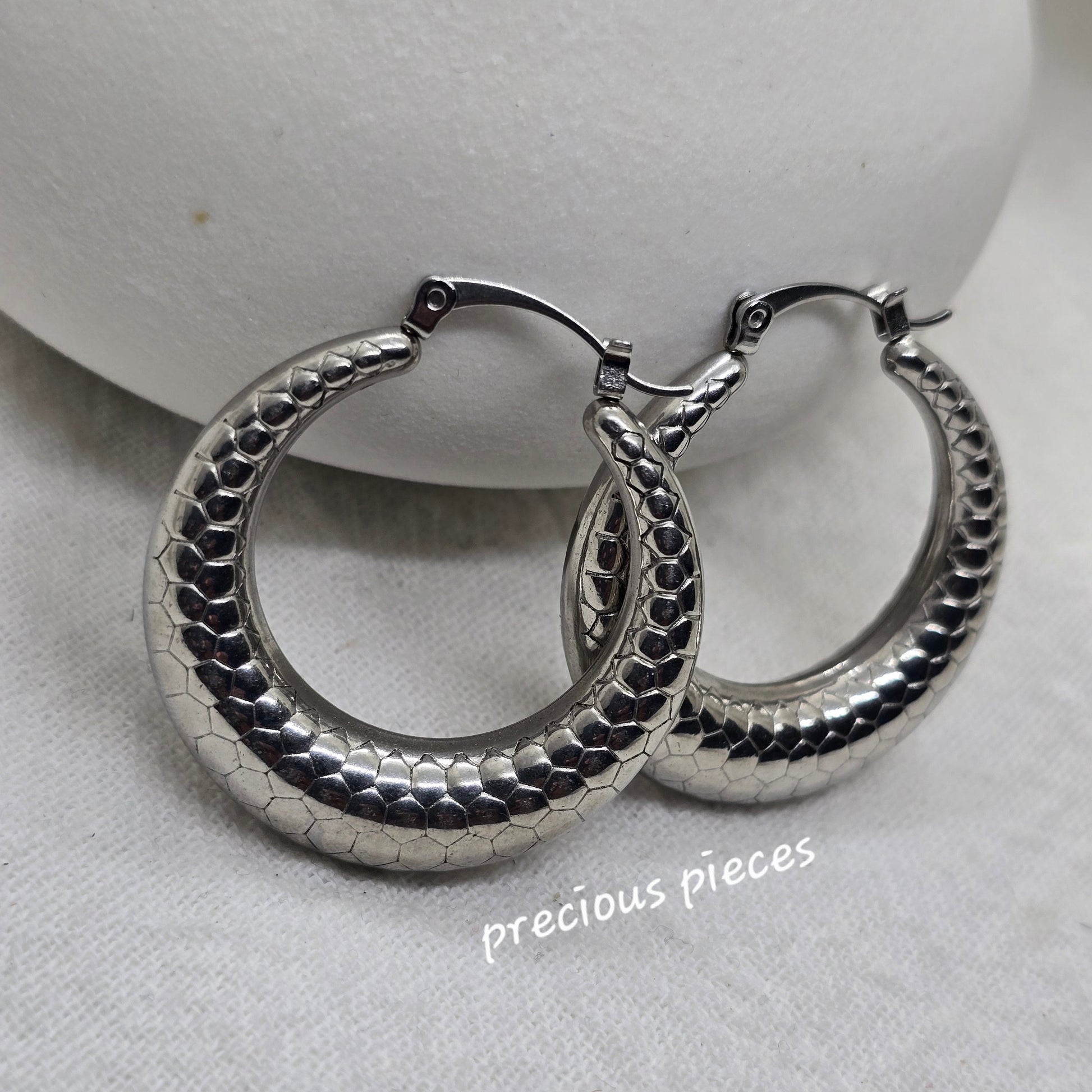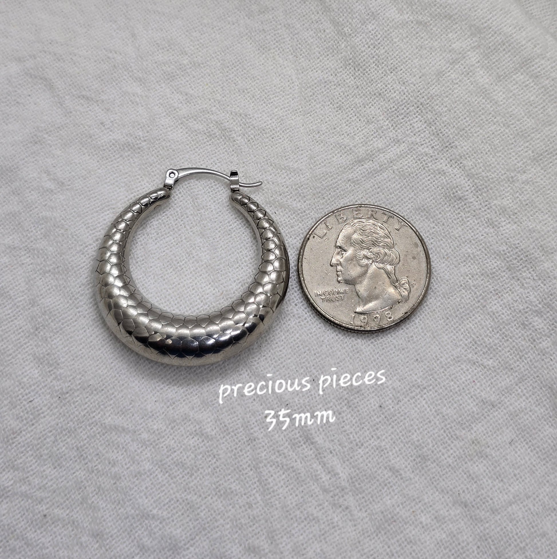 The smaller hoops are about the size of a nickel, and the larger hoops are a little bigger than a quarter. Pictures are enhanced to show details.